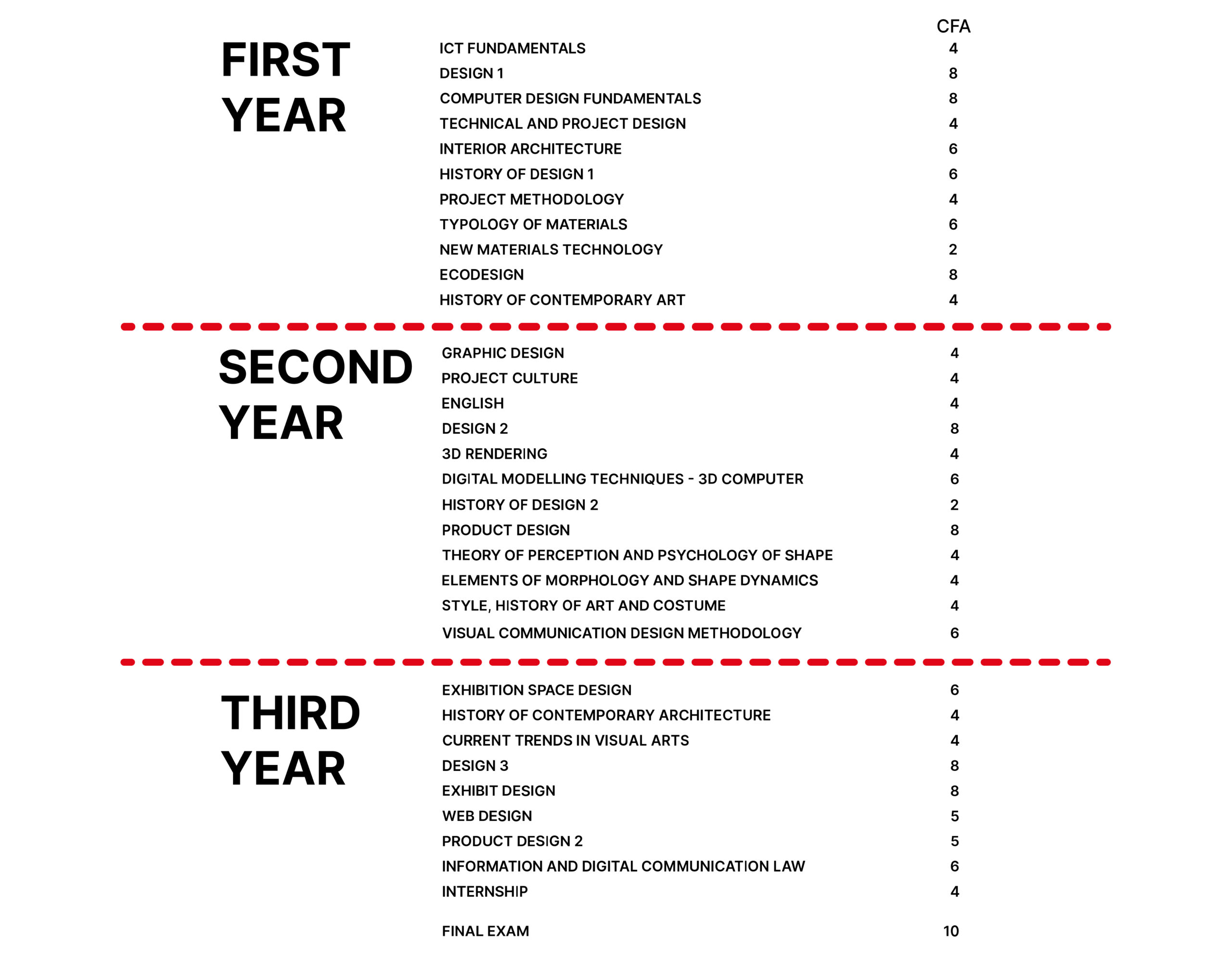 The Bachelor’s Degree in Design aims to provide students with a broad and in-depth acquisition of specialized knowledge and skills in Product, Interior, Graphic, Exhibit Design and Visual Communication. Here, students acquire fundamental logical and technological tools to support their creativity, to operate in a conscious and interdisciplinary way in the wide field of design